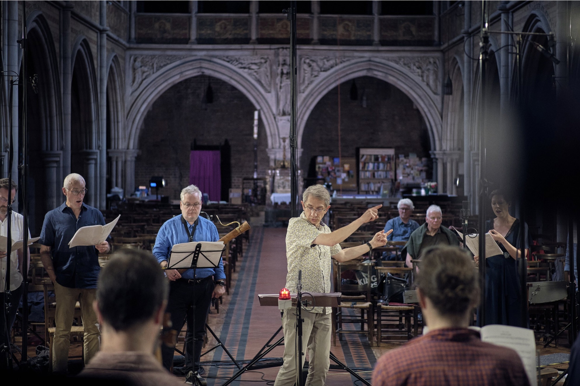 The choirs were kept together by a maestro conducting with a roll of paper. That beat was relayed by special sub-conductors (their sole job) to the other choirs.